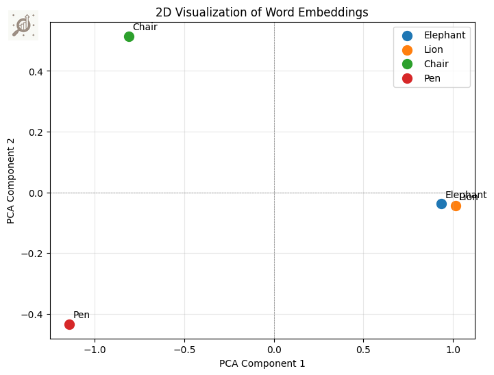 To visualize the semantic relationships in 2D as shown in below graph, you can perform dimensionality reduction (e.g., PCA or t-SNE) on these embeddings.