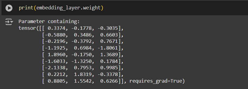 embedding_layer = torch.nn.Embedding(vocab_size, output_dim)This would result in a 9x3 weight matrix: