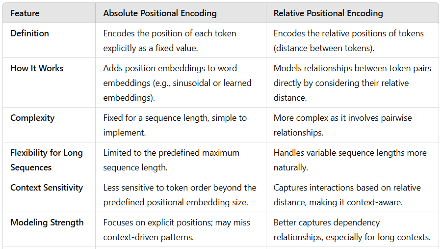 Note: 1. Absolute Positional Encoding is suitable when explicit-order of tokens order are priorities, especially for shorter or fixed-length sequences.